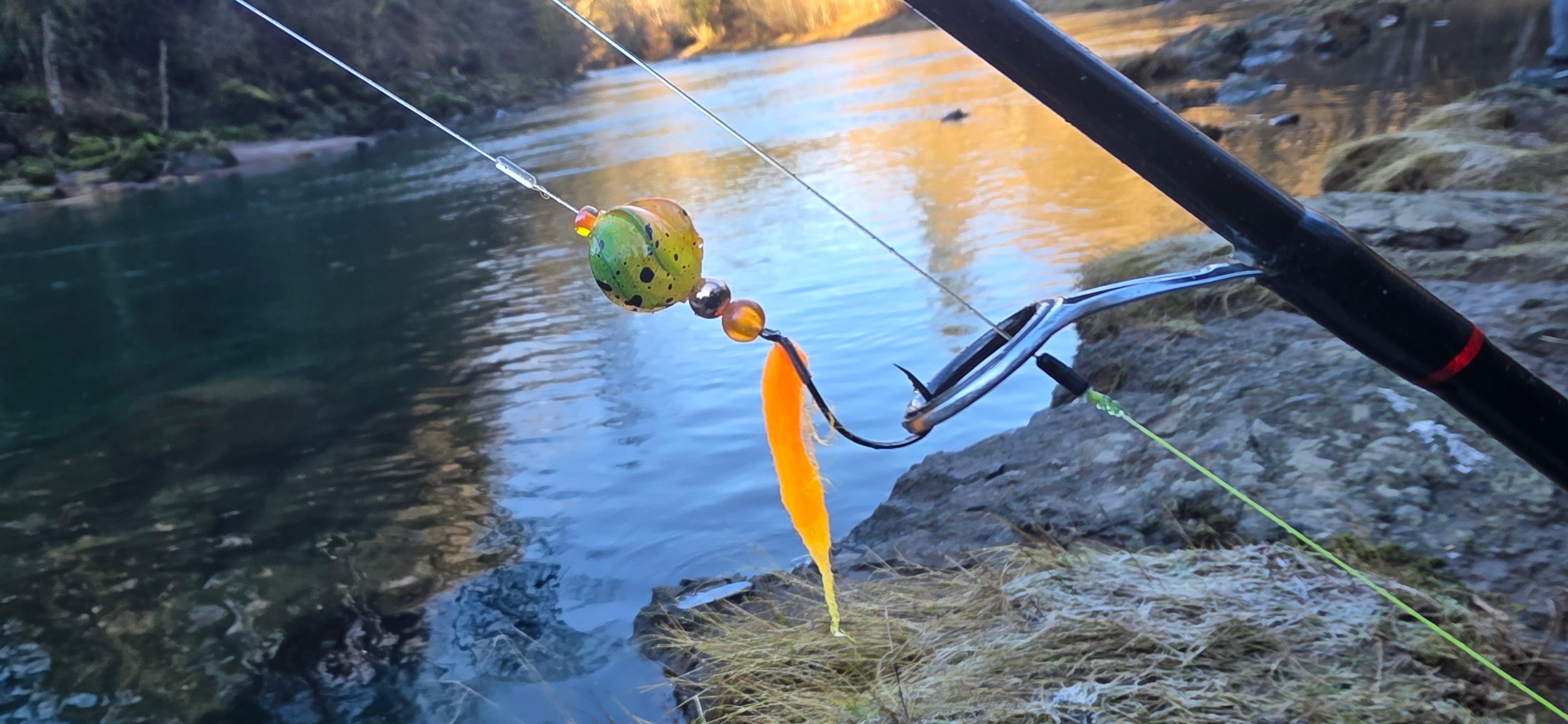 The “Spin-Roe” is a spinning lure with a round bead-like profile which appears to dynamically change colors as it spins in the water. It is hard, hollow, and it floats. The line hole is slightly off-center causing a wobble motion. Position the narrow end facing upriver for a faster spin or downriver for a slower spin and increased wobble motion.